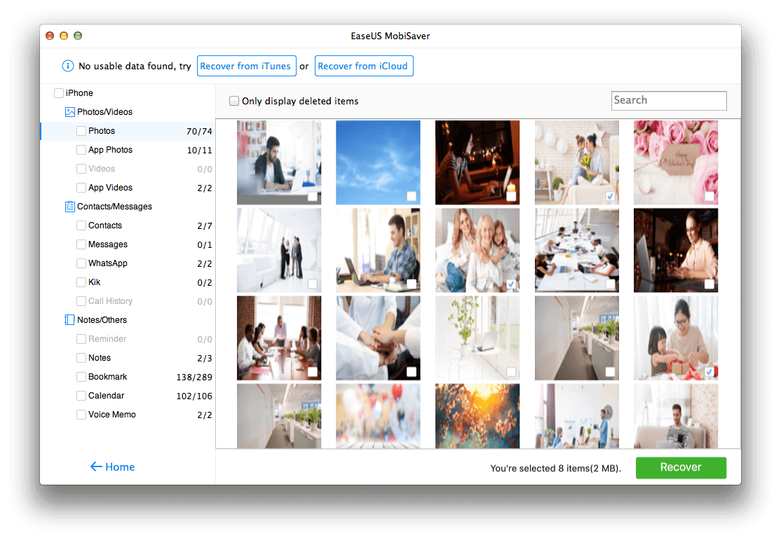 EaseUS MobiSaver is an instant method to recover your lost iPhone data free on Mac. In clicks, get deleted photos, videos, contacts, messages, call logs, notes and more files come back to you.