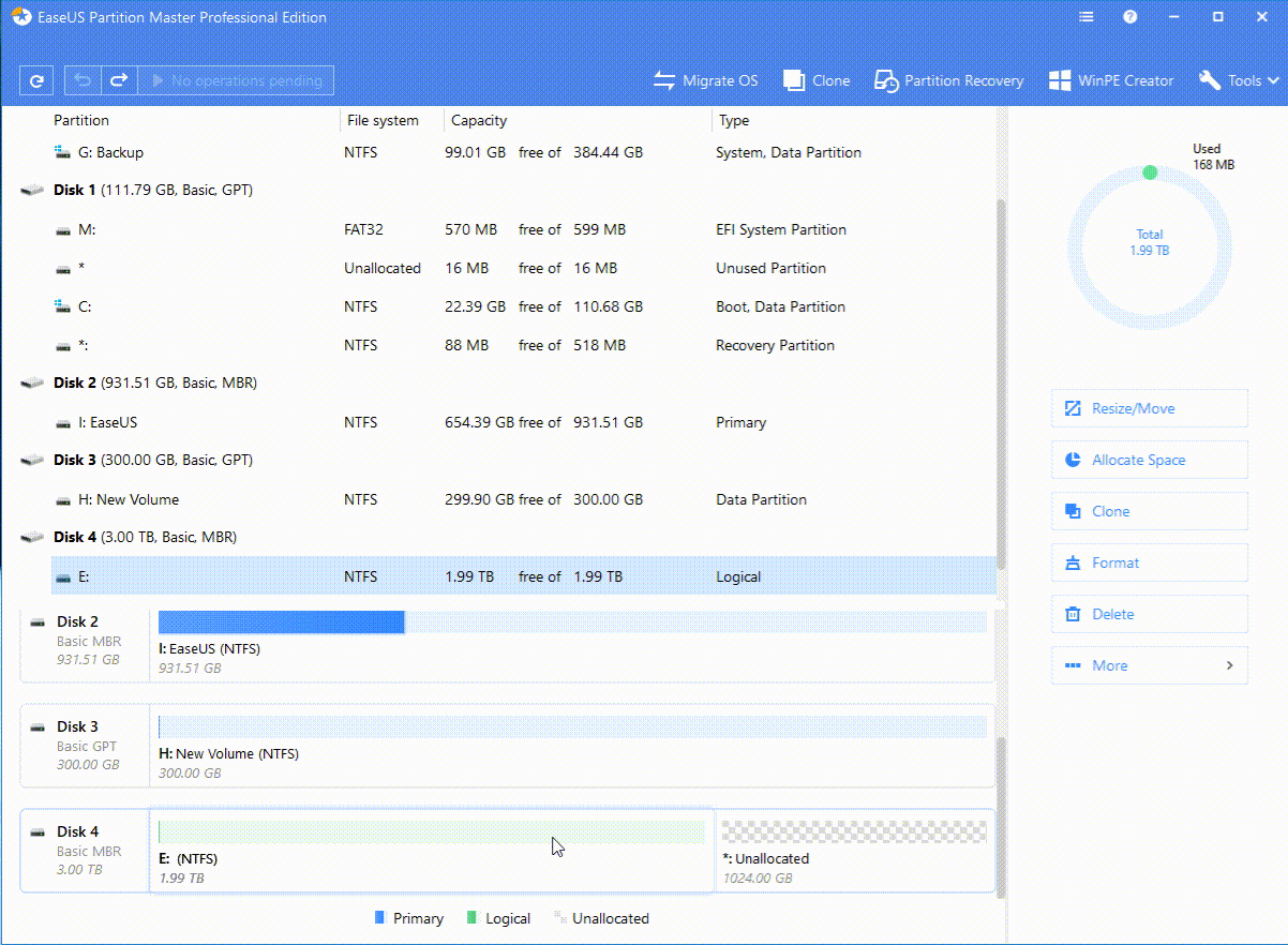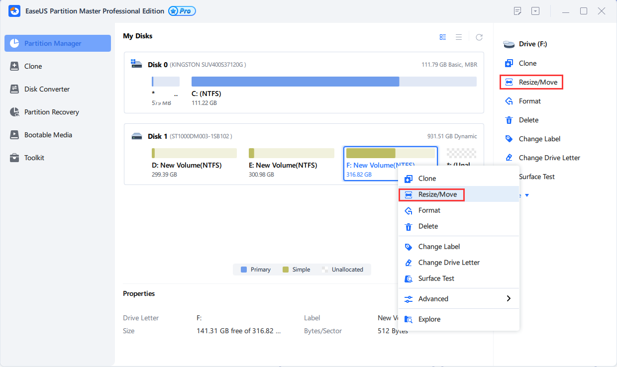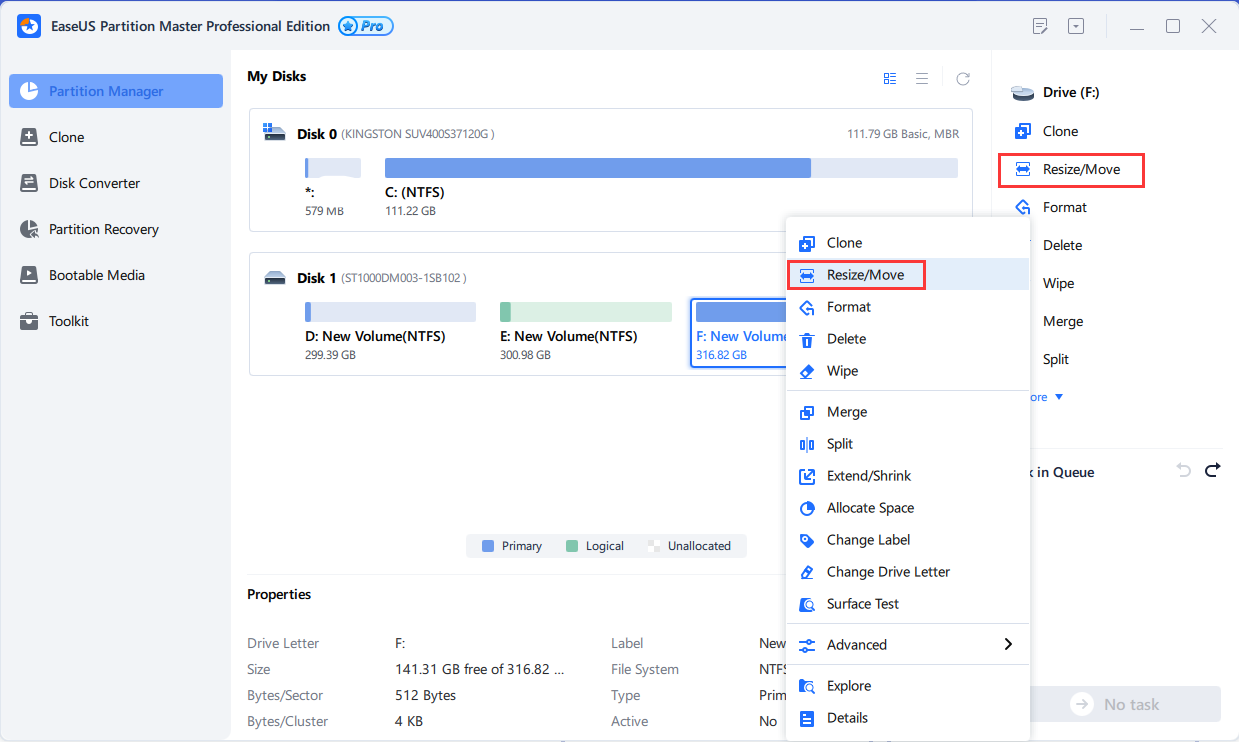 1. Select a partition/volume, and click Move/Resize from the Feature List.