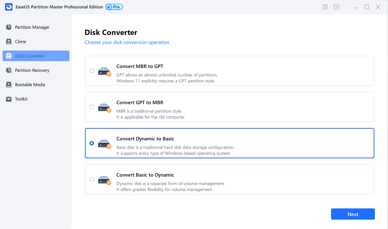 2. Choose the third option Convert Dynamic to Basic, then select the disk you want to convert to continue.