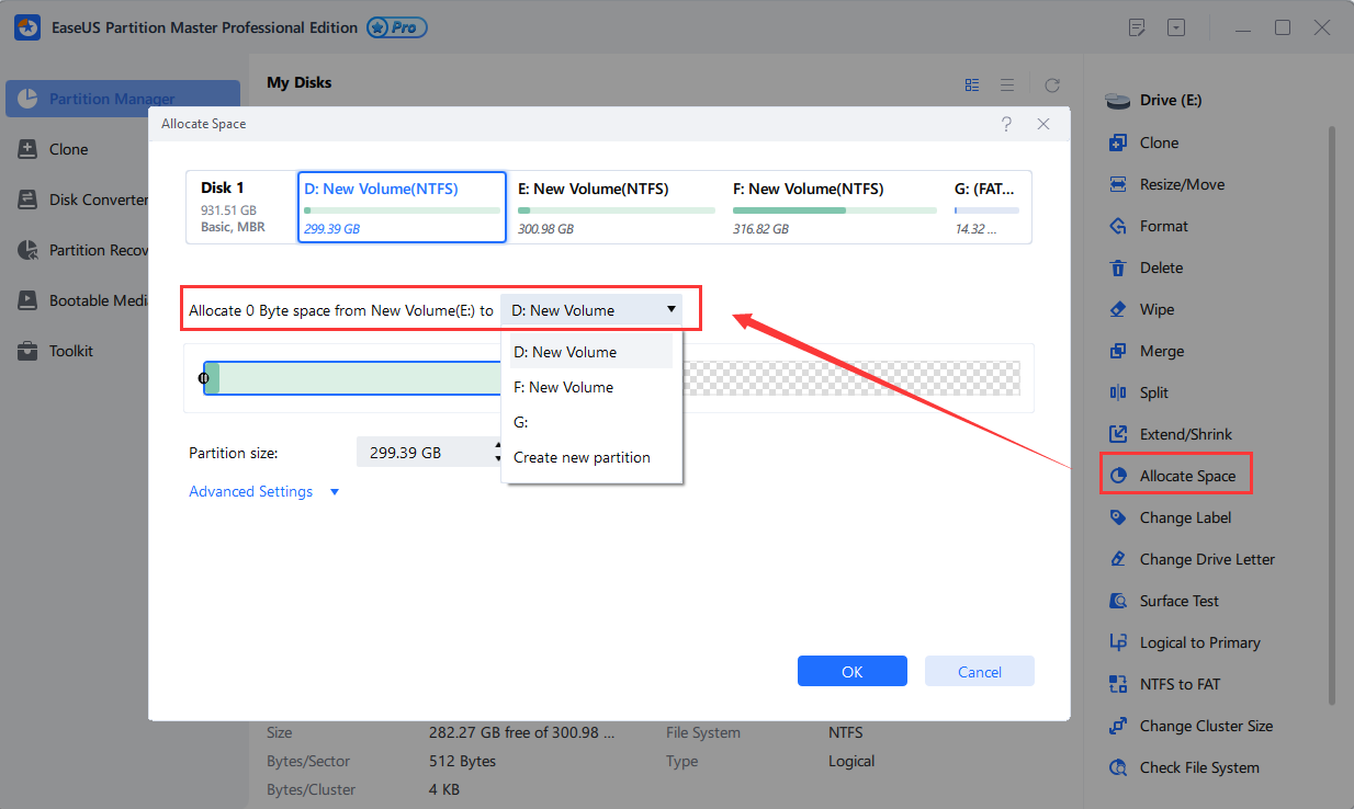 1. Please choose a partition on your hard drive and click on Allocate Space from the list of features.
