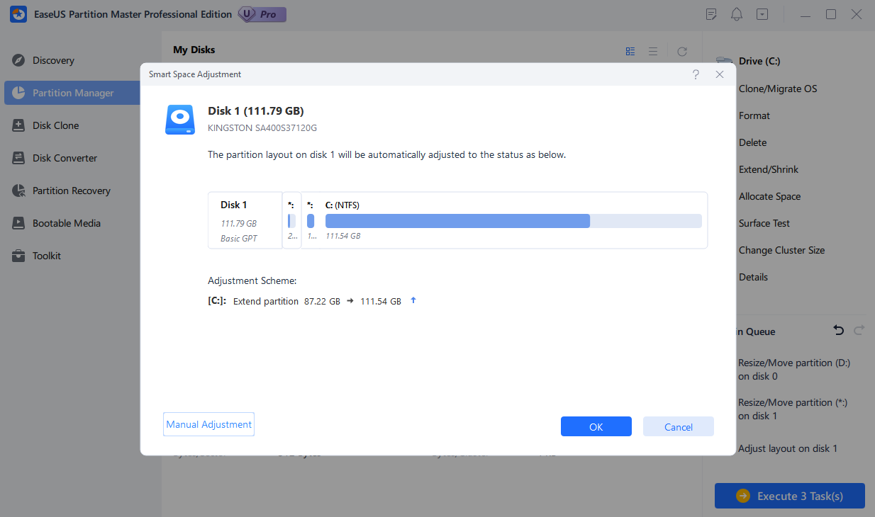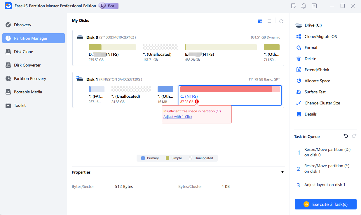 After clicking on Adjust with 1-Click, EaseUS Partition Master will intelligently adjust the partition size to resolve the low space issue. You will only need to click on Proceed to continue the process.