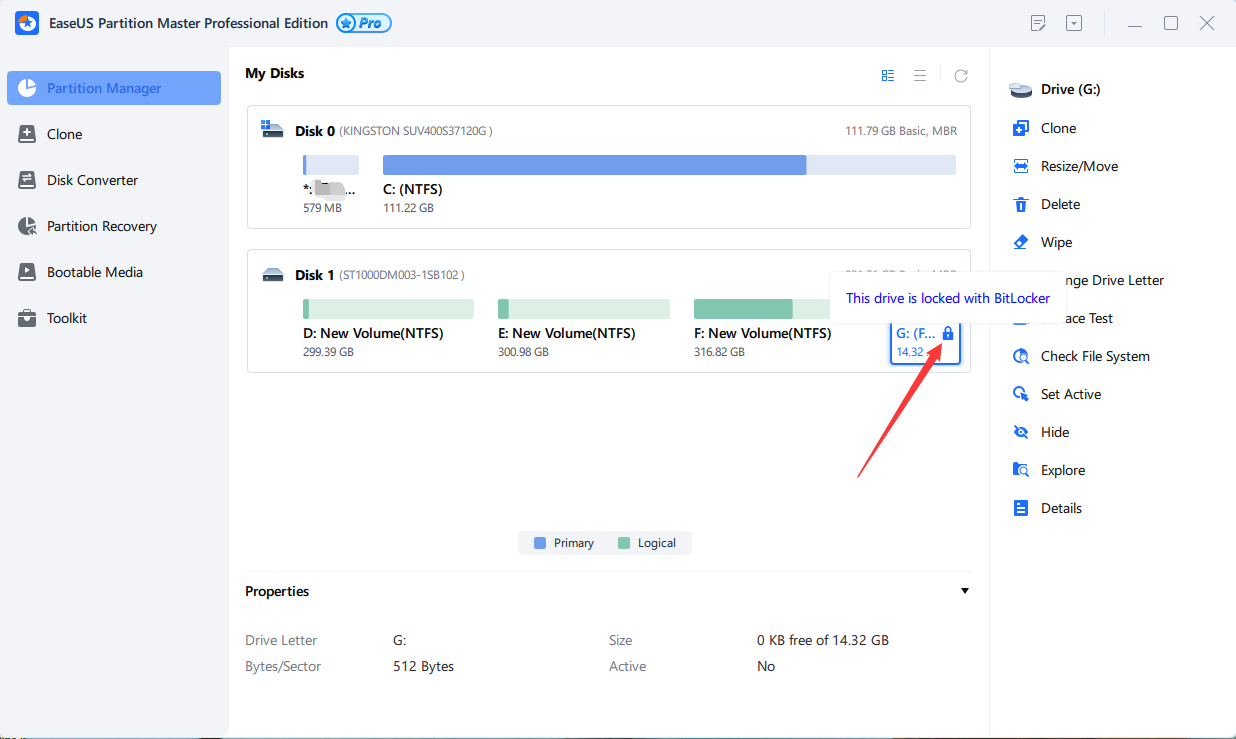 EaseUS Partition Master offers support for BitLocker partitions, allowing you to perform operations such as resizing, moving, copying, and more. If a BitLocker partition is locked, its status will be displayed in the software, and clicking the Unlock button will prompt you to enter a password to unlock it.