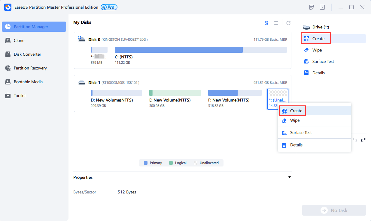 1. Please select the unallocated space on your hard drive, and then either click on Create from the Feature List, or right-click on the selected space. In order to create a partition or dynamic volume, you must first select the appropriate partition/volume type and add the necessary disk(s) to this volume before moving on to the next step.