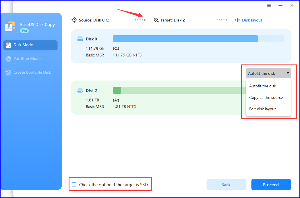 • “Autofit the disk” resize the layout on destination disk according to the size of it to make the disk as the best status.
