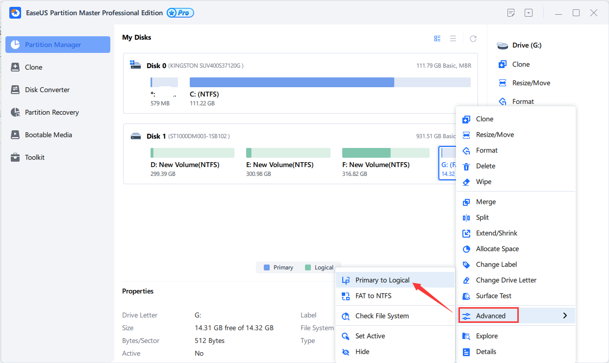 1. Right-click the logical partition that you want to convert to primary and then click Logical to Primary.