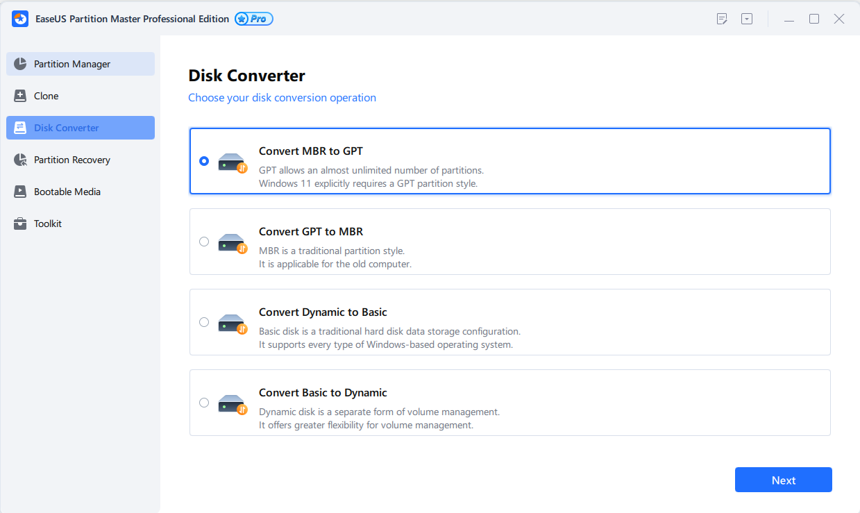 This feature allows you to convert an MBR disk to a GPT disk without losing any data. MBR disks can only utilize a maximum of 2TB of space on a hard drive. Converting an MBR drive to GPT can easily overcome this limitation.
