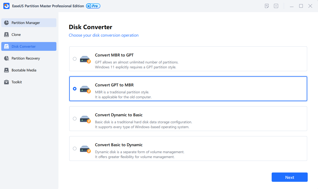 This feature allows you to convert a GPT disk to MBR disk without data loss.