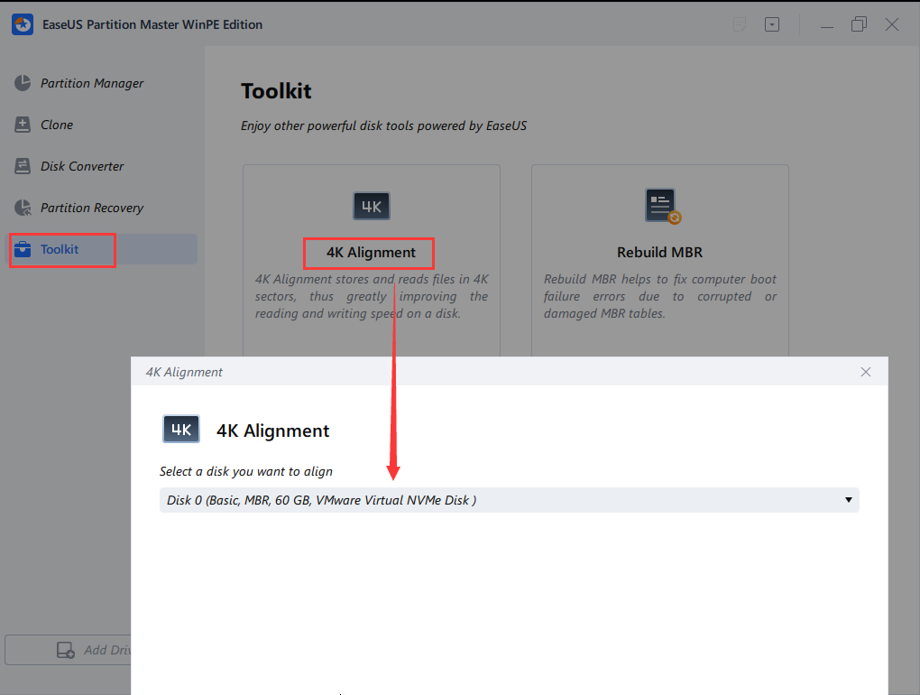 EaseUS Partition Master includes a 4K alignment function to optimize the performance of SSDs by aligning the 4K sectors. This feature can be found in the Toolkit.