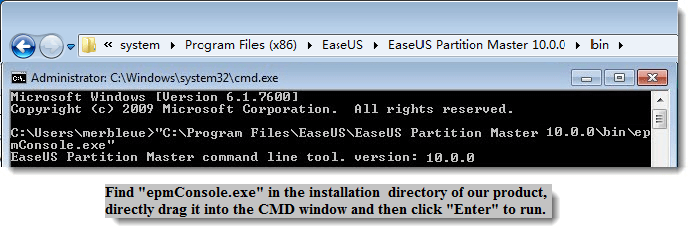 2. Drag the icon of "epmConsole.exe" from the product installation folder into CMD window or simply locate "epmConsole.exe" in CMD.