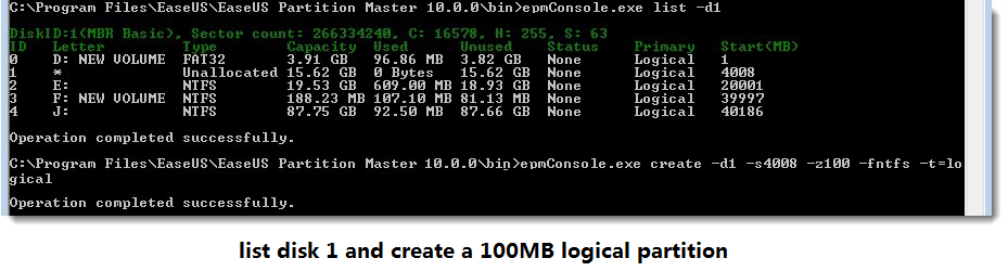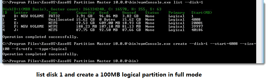 Input "epmconsole.exe list -d1" to list the information of Disk 1. And the following command is to create a new logical partition. You need to input "epmconsole.exe" at the front every time when you want to do any operation using the command line. "-d1"=select Disk 1, "-s4008"=create a partition from 4008MB space of the hard disk (you can also omit these arguments, and it will create a partition from the first unallocated space acquiescently), "-z100"=partition size is 100MB, "-fntfs"=file system is NTFS, "-t=logical"=create a logical partition.