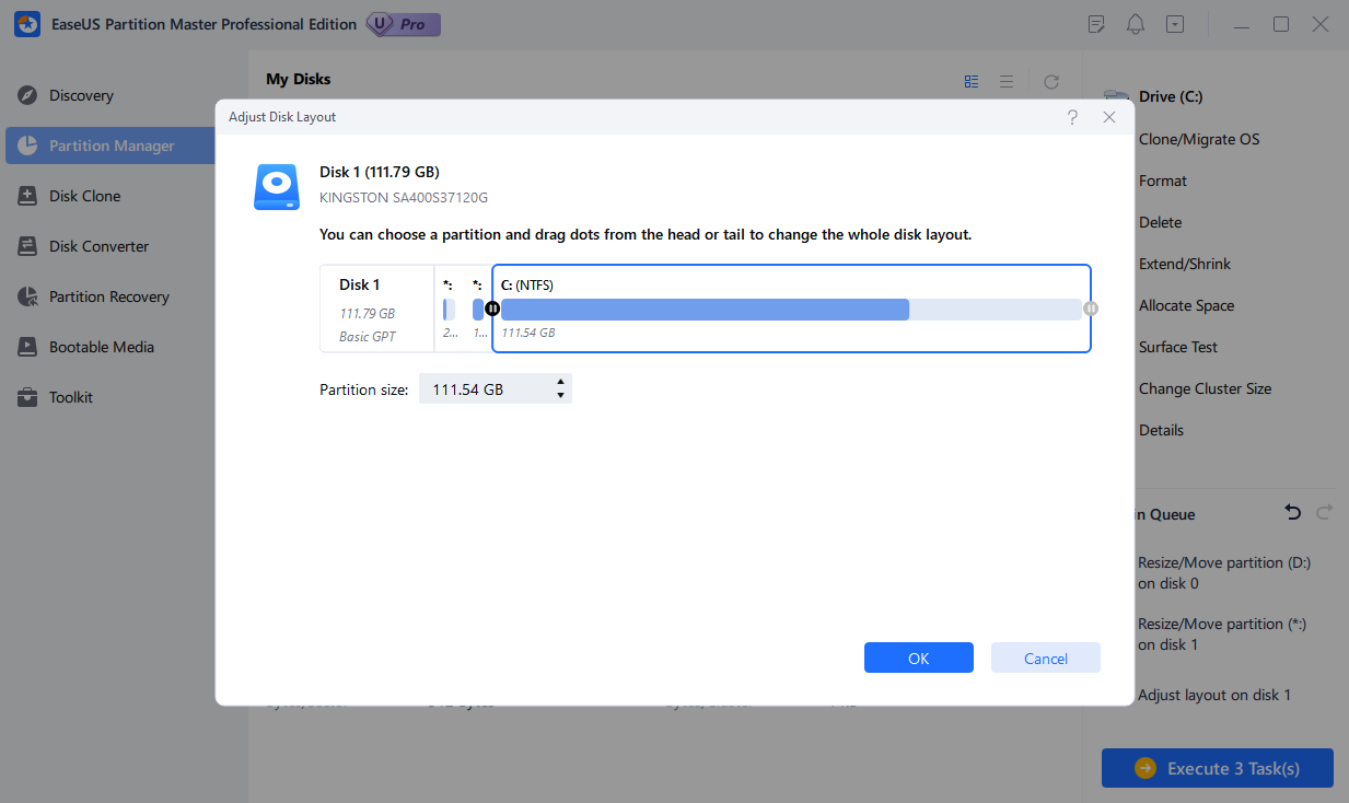 After clicking on Adjust with 1-Click, EaseUS Partition Master will intelligently adjust the partition size to resolve the low space issue. You will only need to click on Proceed to continue the process.