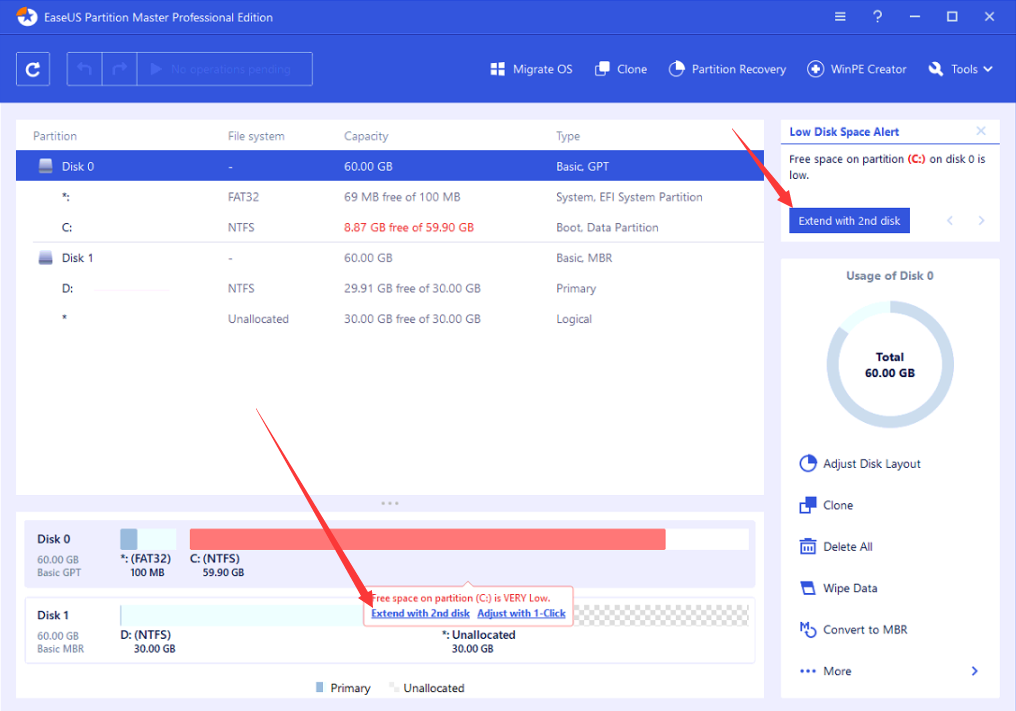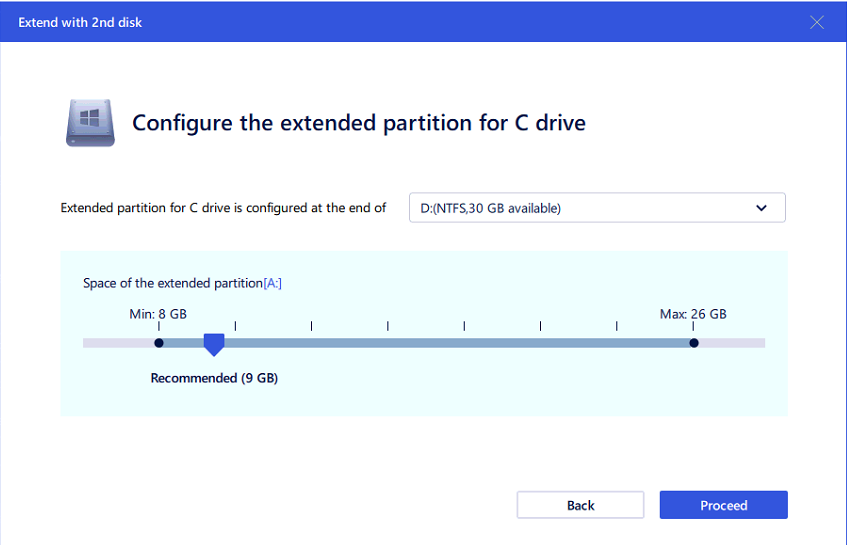 If the free space on the C drive is running low and there is limited space available on its host disk, you can use Extend with 2nd disk option to create additional space by moving program files, user files, program data, or other files from the C drive to another drive within the same computer. This option provides an alternative to expanding the C drive onto a secondary disk.