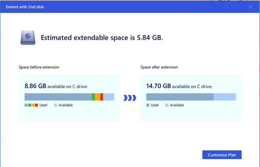 2. The software will automatically calculate the amount of space that can be extended. Please click on Customize Plan to proceed.