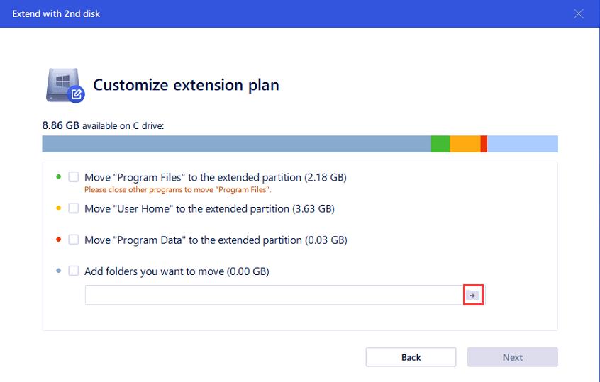 Note: Once you move the folders to the other hard drive using Extend with 2nd Disk feature in this software, they cannot be transferred back to the C drive. Therefore, please carefully double-check each step before proceeding.