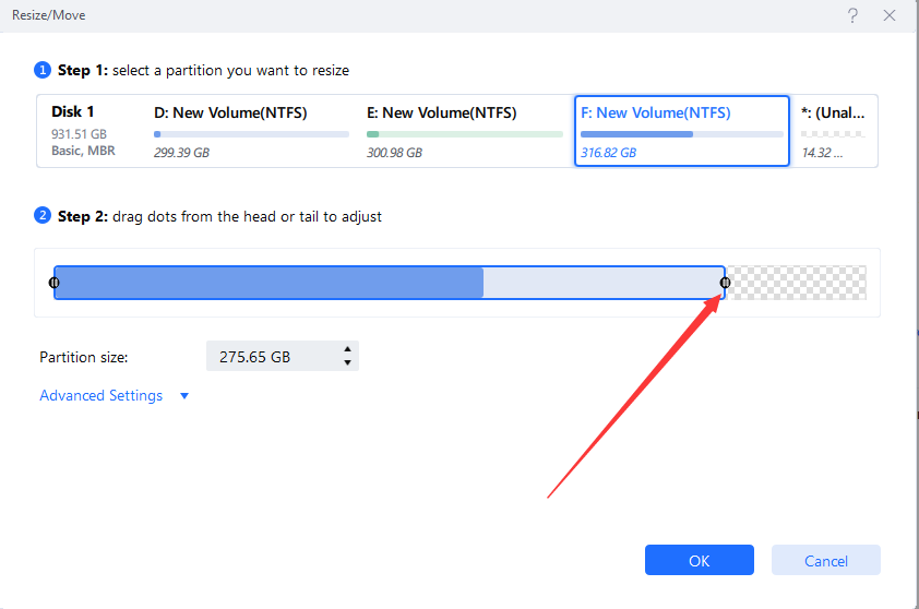 1. Select a partition/volume, and click Move/Resize from the Feature List.