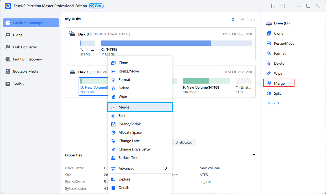 The merge function allows you to combine the disk space from two separate partitions into one larger partition. It is important to note that only NTFS, ReFS, FAT12, FAT16, and FAT32 partitions are compatible with this feature. The order in which you select the two partitions is also crucial. To save time and energy, we recommend merging the partition with less data into the other partition.